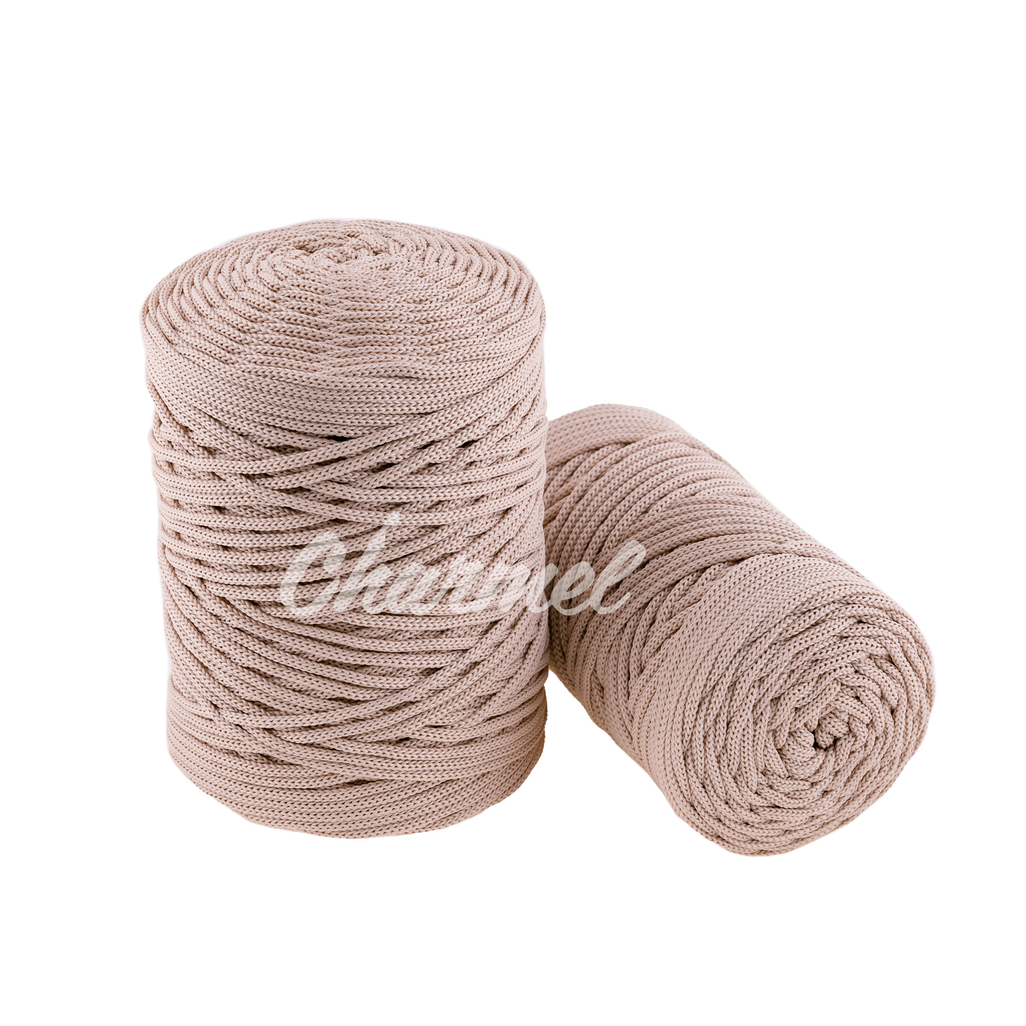 Ленты и шнуры для вязания и для макраме из полиэфирного шнура устойчивы к истиранию. Изделия из полиэфирного шнура рекомендуется стирать деликатной стиркой при 30°C. Каждый моток шнура Charmel имеет маркировку с указанием цвета, длины шнура в намотке и номера партии. Это гарантирует работу с одинаковым по цвету материалом и высокое качество готового изделия. Маркировка также содержит рекомендации по выбору инструмента для вязания крючком или спицами.