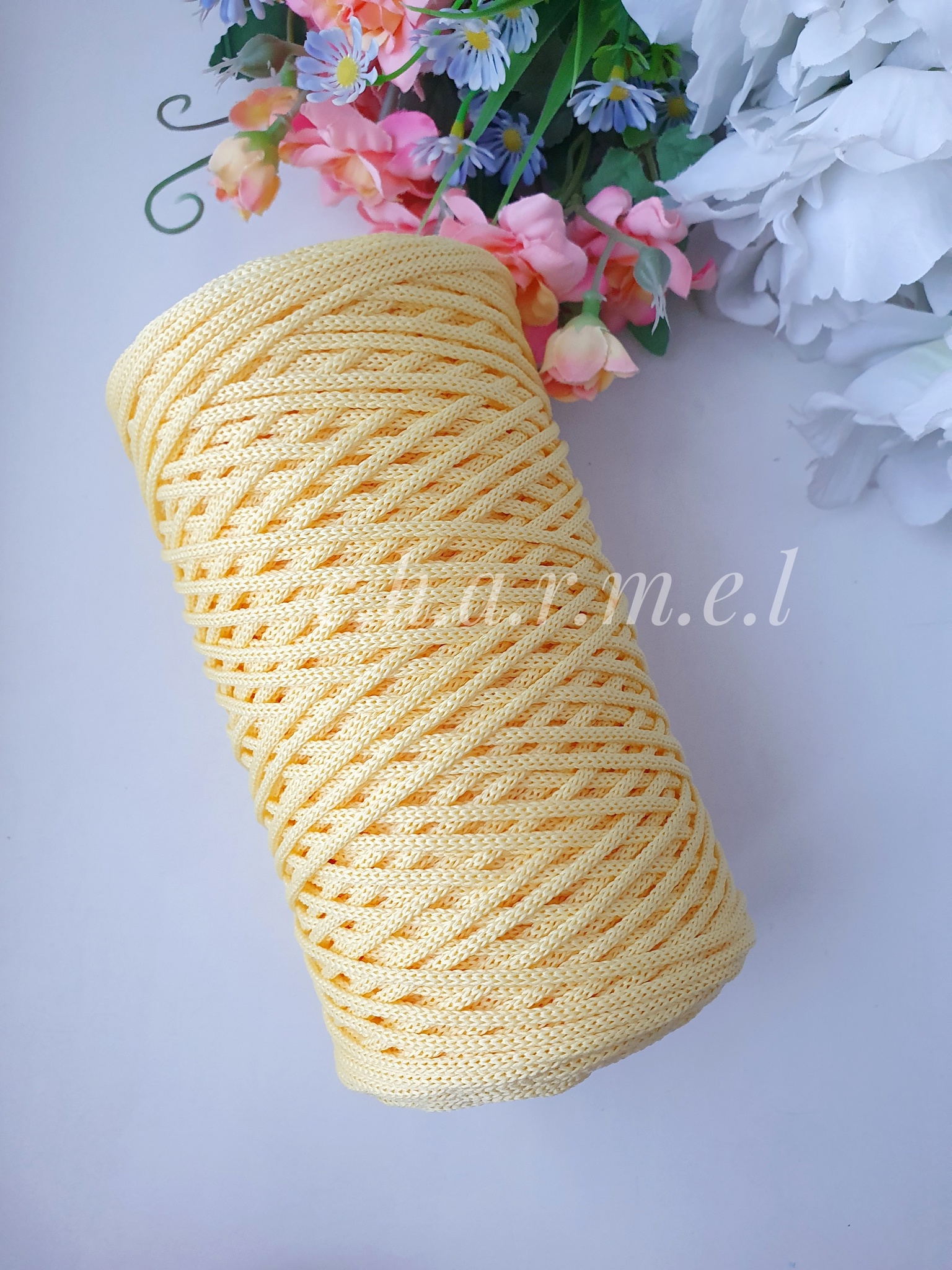 Полиэфирные шнуры устойчивы к истиранию. Изделия из полиэфирного шнура рекомендуется стирать деликатной стиркой при 30°C, он быстро сохнет. Каждый моток шнура Charmel имеет маркировку с указанием цвета, длины шнура в намотке и номера партии. Это гарантирует работу с одинаковым по цвету материалом и высокое качество готового изделия. Маркировка также содержит рекомендации по выбору инструмента для вязания крючком или спицами.